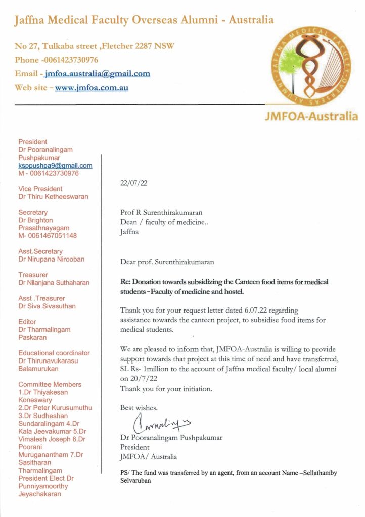 Due to the recent economic crisis in Sri Lanka, the majority of undergraduates are attending university away from their hometowns and are faced with massive challenges. These include finding nutritious and affordable food, transport, and, most importantly, carrying out their academic activities. JMFOA Australia donated Rs 1.2 million through Local Alumni to the canteens belonging to the Medical Faculty and Medical Students’ Hostel in Jaffna.