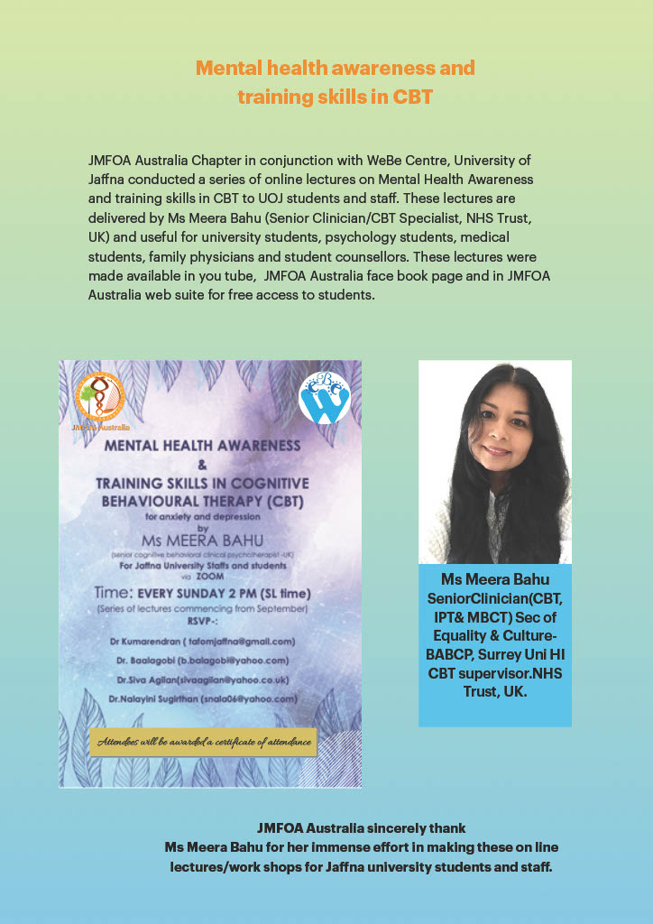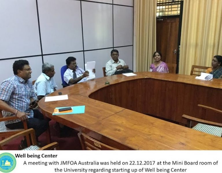 Jaffna Medical Faculty Overseas Alumni (JMFOA) – Australia facilitated the establishment of the Well-Being Center, supported it financially and was involved in training and strengthening the activities of the Centre. The JMFOA – Australia supports this initiative and sponsors the initial capital expenditure (Rs. 1,481,000.00) and first two years’ salary of the Coordinator of Counselling Services of Well-Being Center (Rs.1,440,000.00).JMFOA Australia has already transferred Rs.2,201,000.00, and JMFOA will transfer the remaining funds to the University Account periodically.